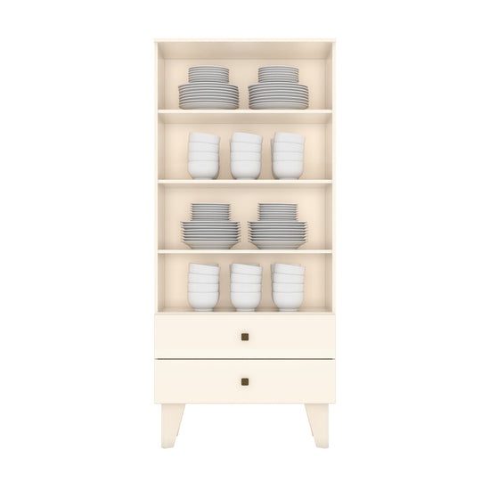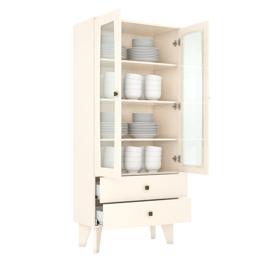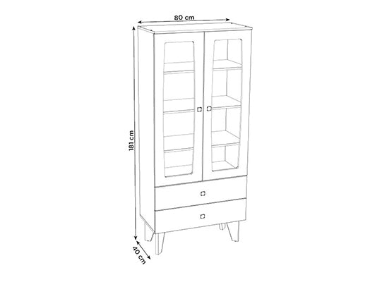 Sofisticada vitrina elaborada en pino industrializado con pintura UV. Equipada con dos puertas abatibles de vidrio y dos gavetas con rieles extensibles, además de modernas patas plásticas, esta pieza logra un equilibrio perfecto entre estilo y funcionalidad.